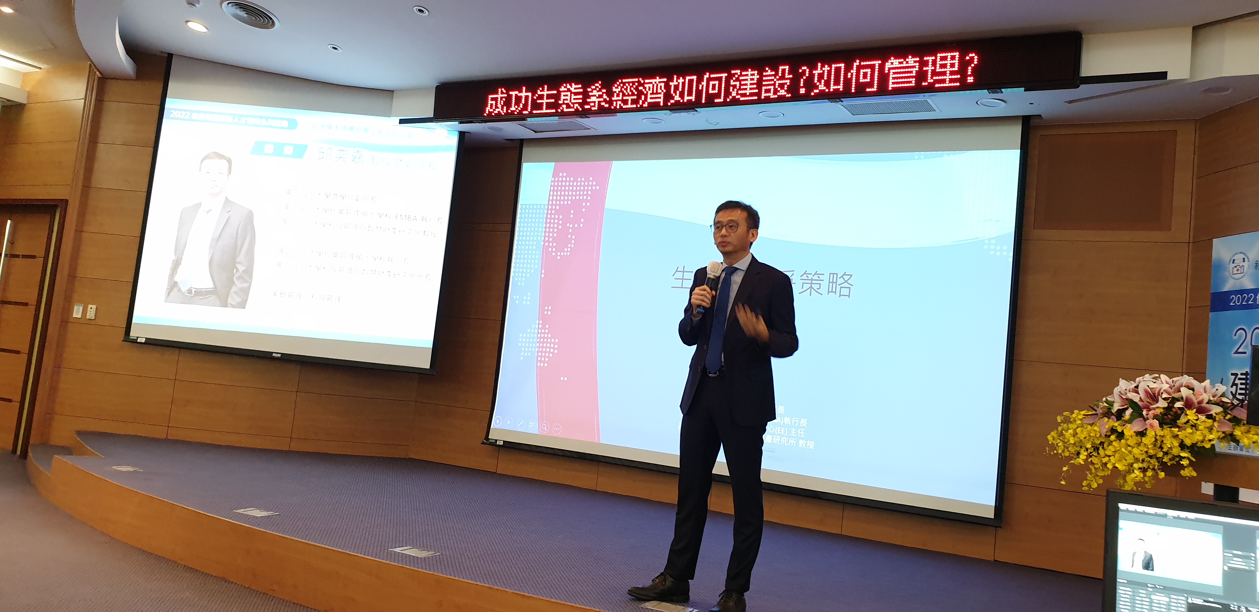 首先由國立政治大學商學院邱奕嘉教授暨副院長,分享「成功生態系經濟如何建設?如何管理?」,如何透過生態系結構相互作用與價值結構分析,向終端顧客提供價值主張,未來也是新經濟時代下重要的商業模式。從生態系競爭策略介紹,緊接著由聯新國際醫院張煥禎總院長,同時也是環台醫療策聯盟的創會秘書長暨最高顧問,帶來「環台醫療策略聯盟創造新價值」分享,從醫療體系來談策略聯盟,也充分體現了生態系的建構,聯新國際醫院從異中求同、同中求異,是醫療結盟最成功的案例,也創造出環台醫療策略聯盟的新價值。