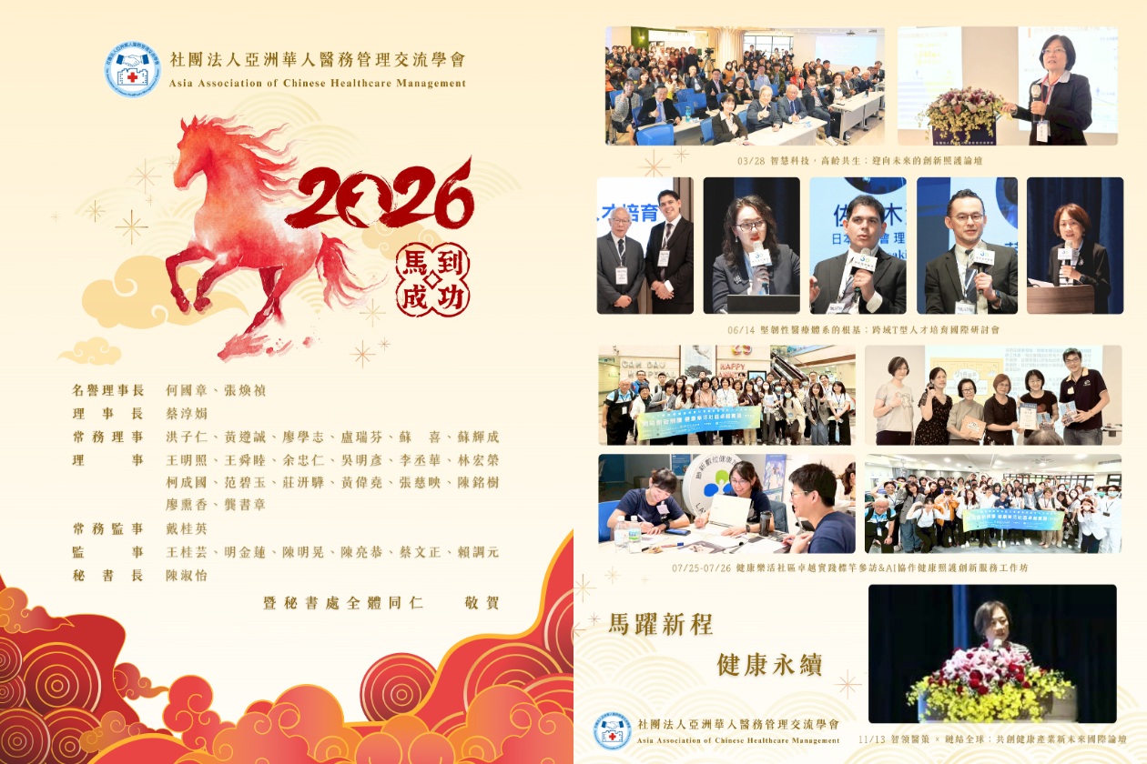 過去一年,亞洲華人醫務管理交流學會持續深化學術研究與跨域交流。因為您的投入與同行,我們得以在醫務管理領域持續深耕,拓展跨域合作,凝聚更多專業能量。